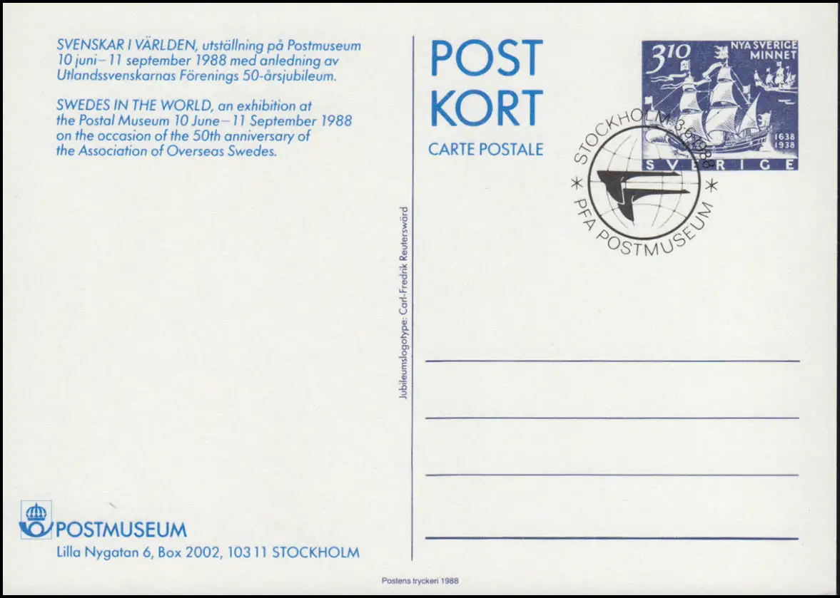 Suède Carte postale P 109 Exposition Suède dans le monde, SSt Stockholm 3.6.88