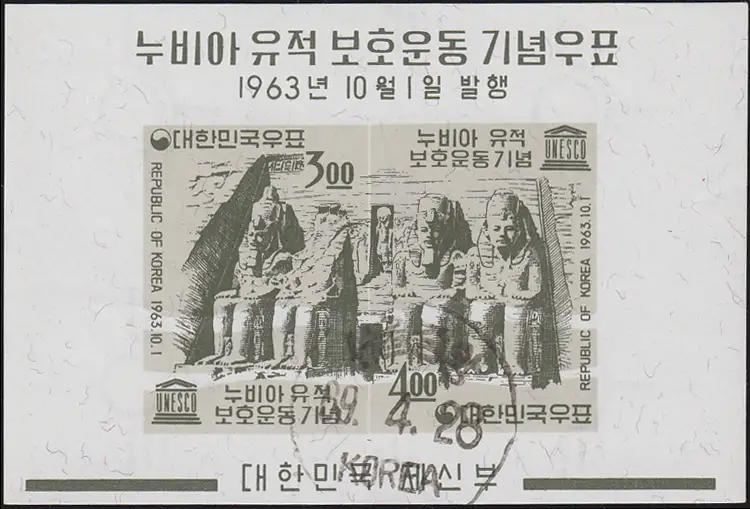 Corée du Sud: UNESCO - Patrimoine mondial Monuments Nubiens 1963, bloc tamponné