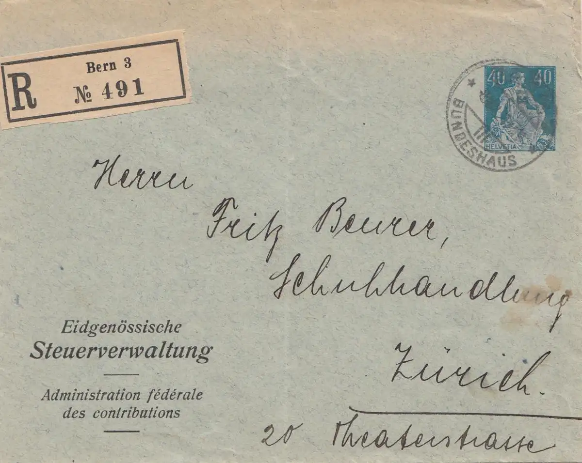 Suisse: 1921: lettre recommandée Administration fiscale de Berne vers Zurich