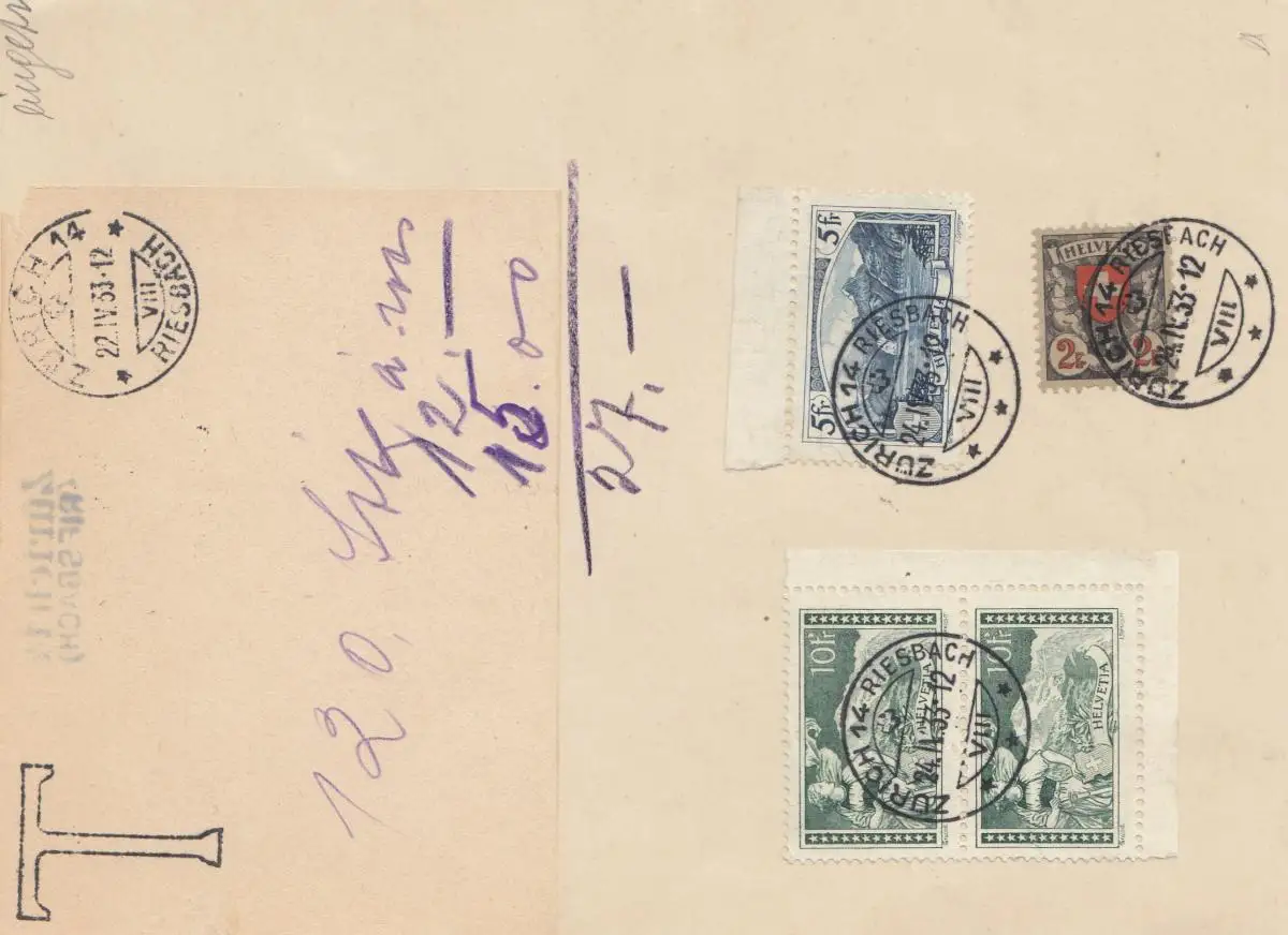 Suisse: 1933: Zurich-Riesbach: Marques à compensation !!!
