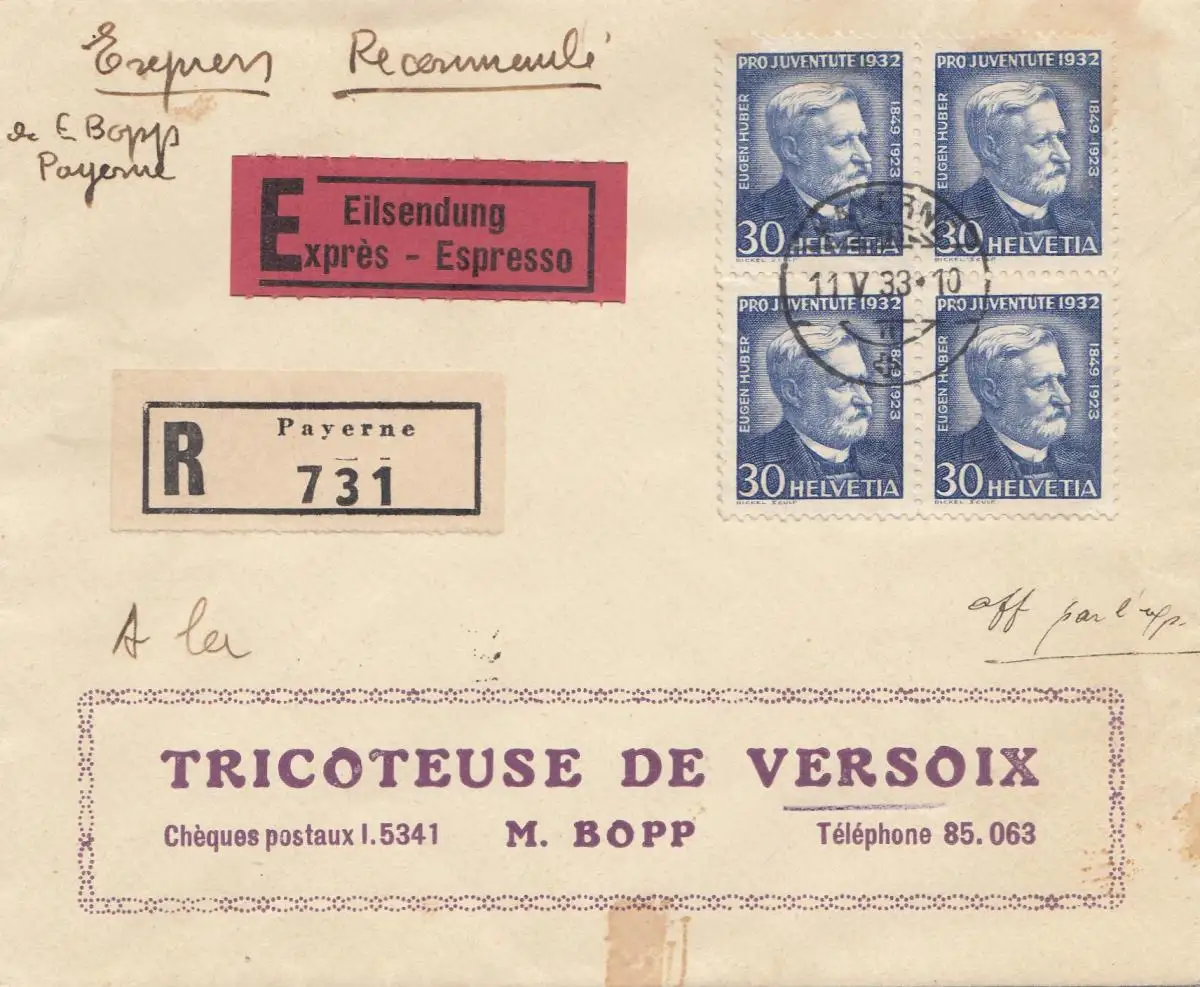 Suisse: 1933: courrier express, lettre recommandée, Payerne versoix