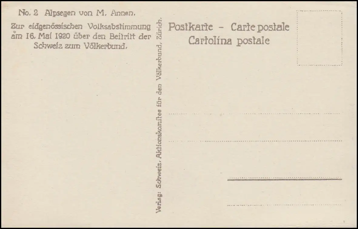 Pour le référendum fédéral du 16 mai 1920 sur l'adhésion de la Suisse à la Société des Nations, numéro 2: Alpsegen de M. Annen Examen: original Numéro d'article: 00000000017081>p>Note: Cet article n'est disponible qu'une seule fois. Vous recevrez exactement l ' article représenté.