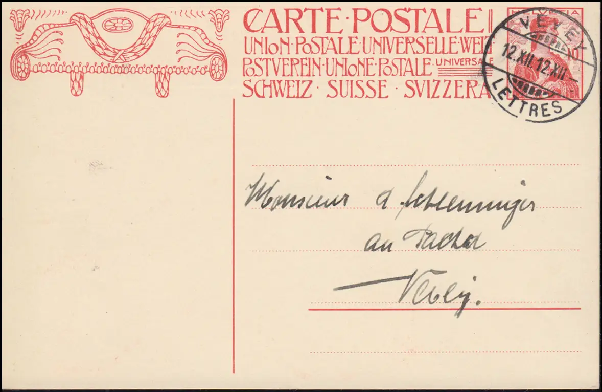 Suisse Carte postale P 68a avec le cachet du siècle VEVEY 12.12.12-12 heures