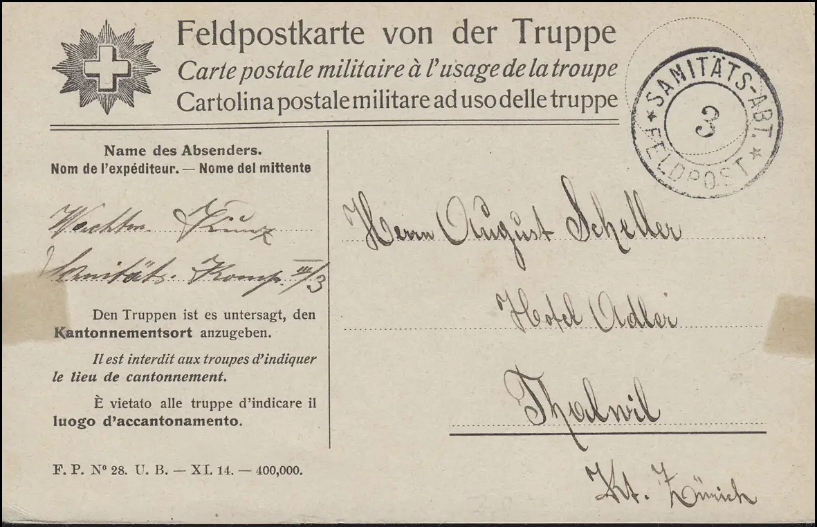 Suisse Carte postale de la troupe SANITY-ABT. 3 FELDPOST vers 1914/1915