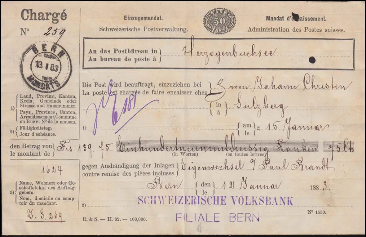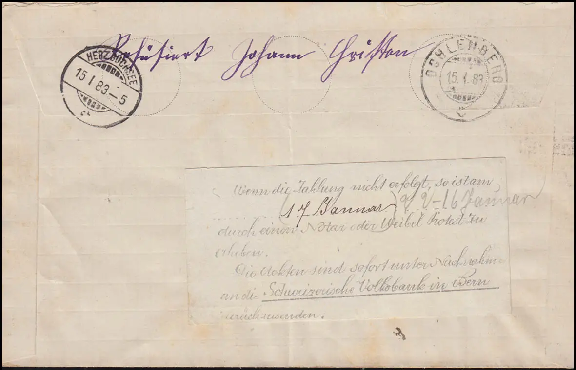 Suisse Translation du courrier AU 2y Schweizer Volksbank BERN 13.1.1883