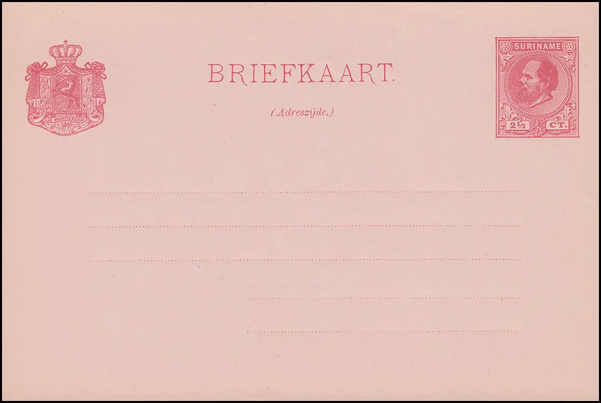 Suriname Carte postale / Post Card 2 1/2 Ct. rose rougeâtre 1888, non utilisé **