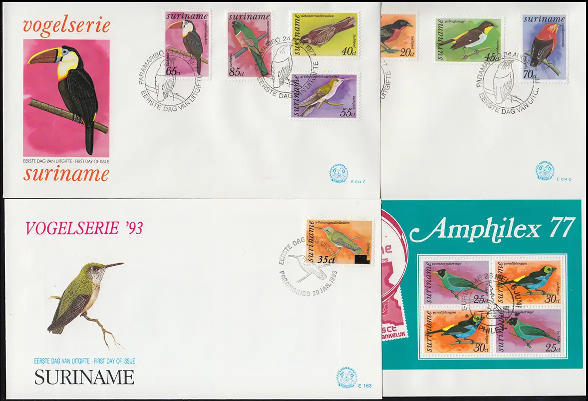 Suriname Oiseaux série: Oiseau 1977 avec 2 blocs et de 1993/94 sur 8 bijoux FDC