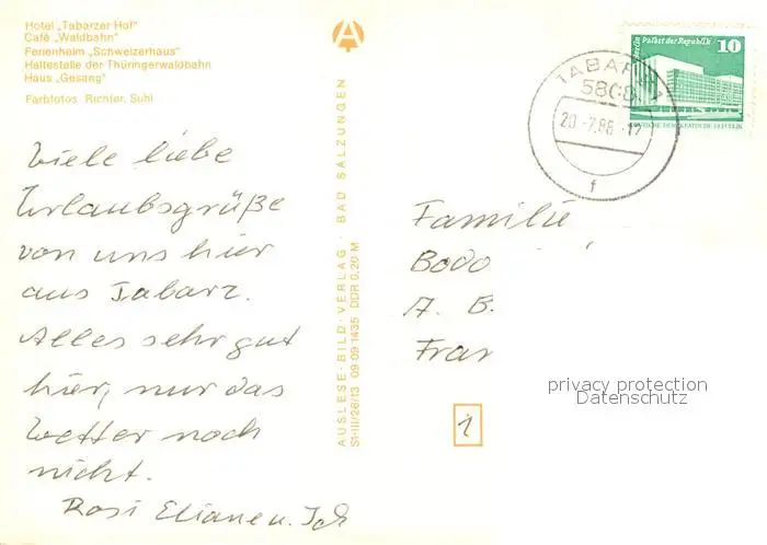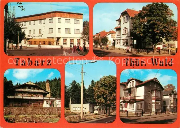 Tabarz Hotel Tabarzer Hof Cafe Waldbahn Ferienheim Schweizerhaus Thueringerwaldbahn Haus Gesant Tabarz postalisch gelaufen 1988 Erhaltung siehe scans [FriedD77] Frierer