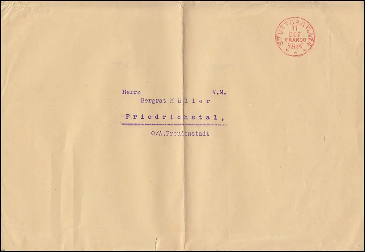 Tampon de facturation STUTTGART No 4 FRANCO 8 Pf. Lettre à Friedrichstal