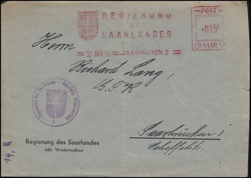 Tampon d'expéditeur gouvernement de la Sarre, lettre locale SAARBRÜCK 30.1.51