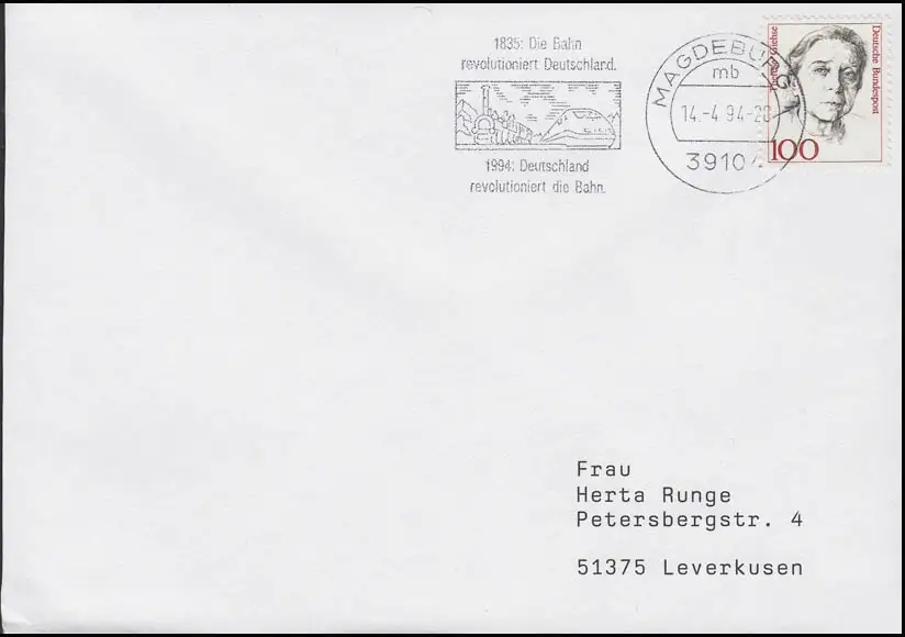 Tampon publicitaire Die Bahn révolutionne l'Allemagne ..., Lettre Magdeburg 14.4.94