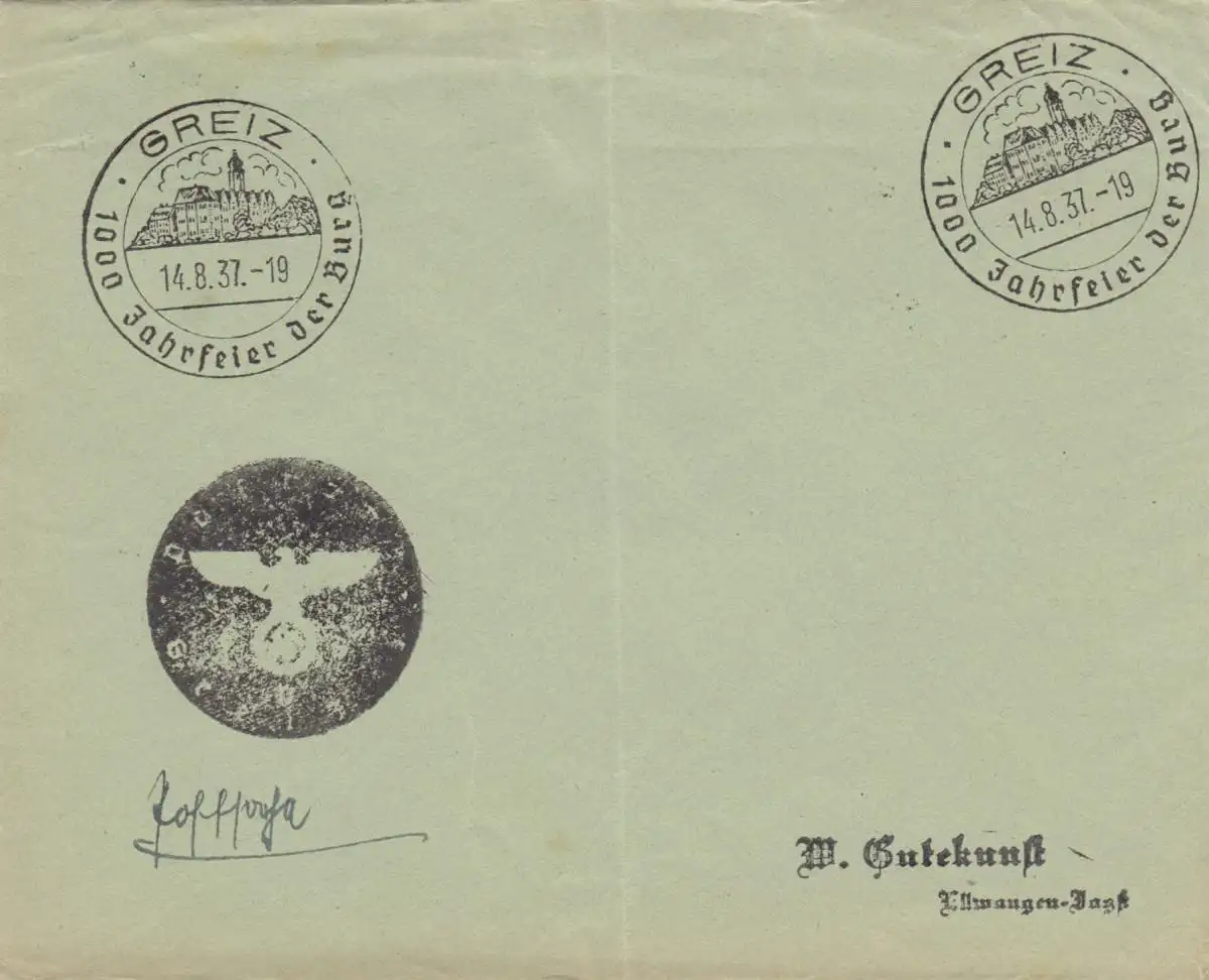 Tampon spécial 1937, Greiz, 1000 célébration annuelle, timbre négatif, courrier