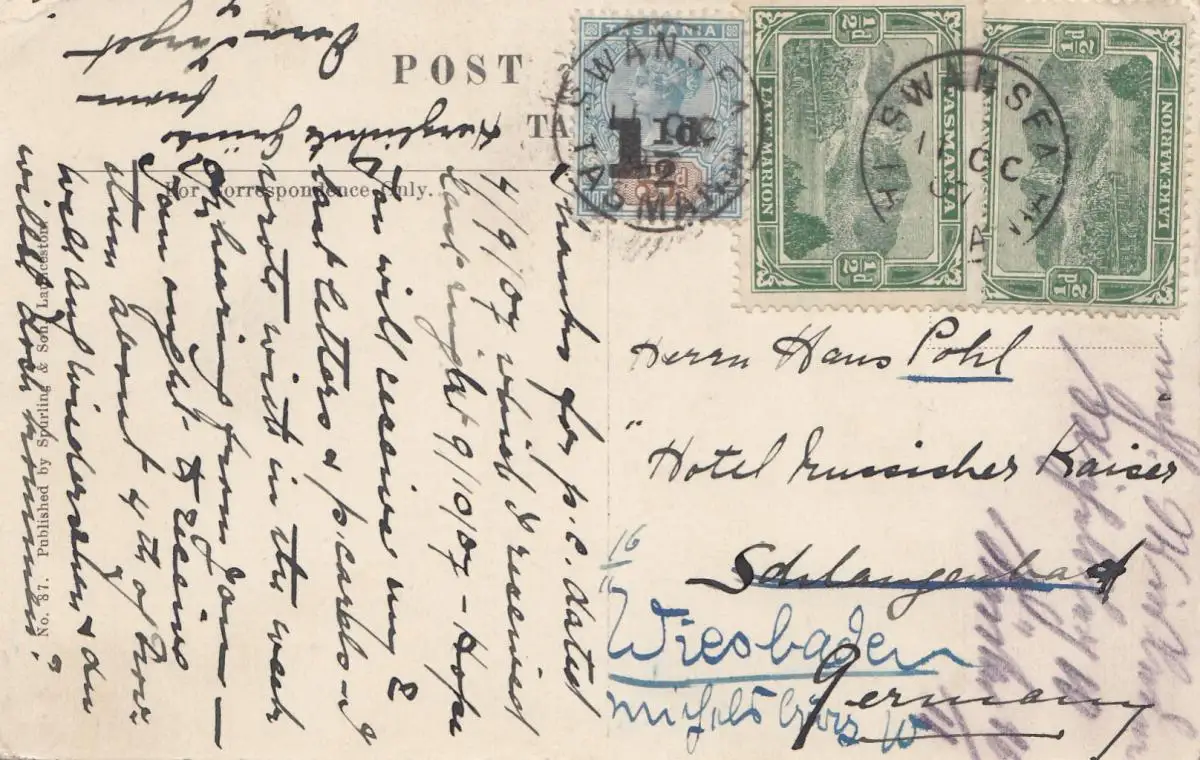 Tasmania: Postcard Swansea to Germany.