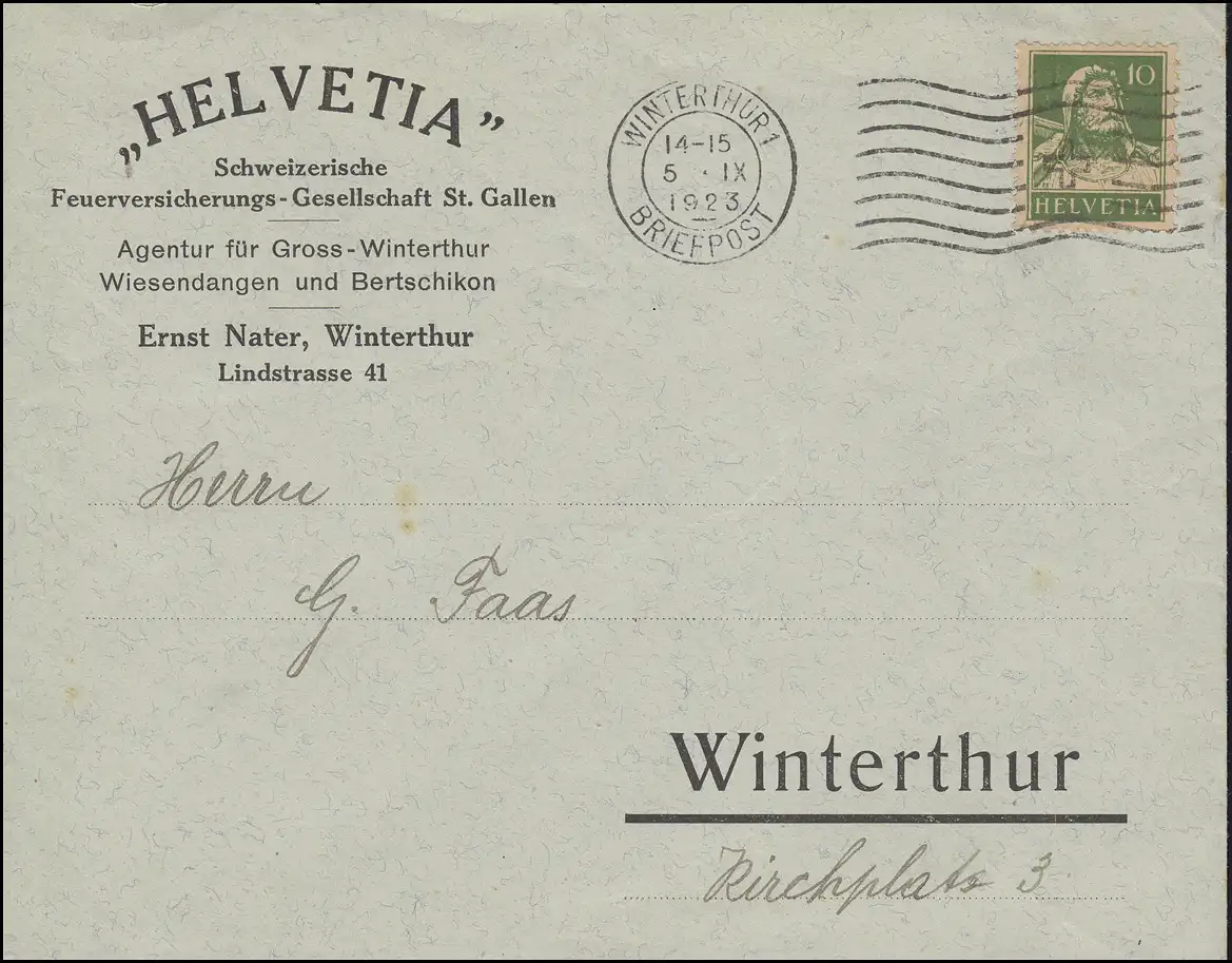 Tell avec arbalète 10 C. EF Lettre locale assurance incendie WINTERTHUR 5.9.1923