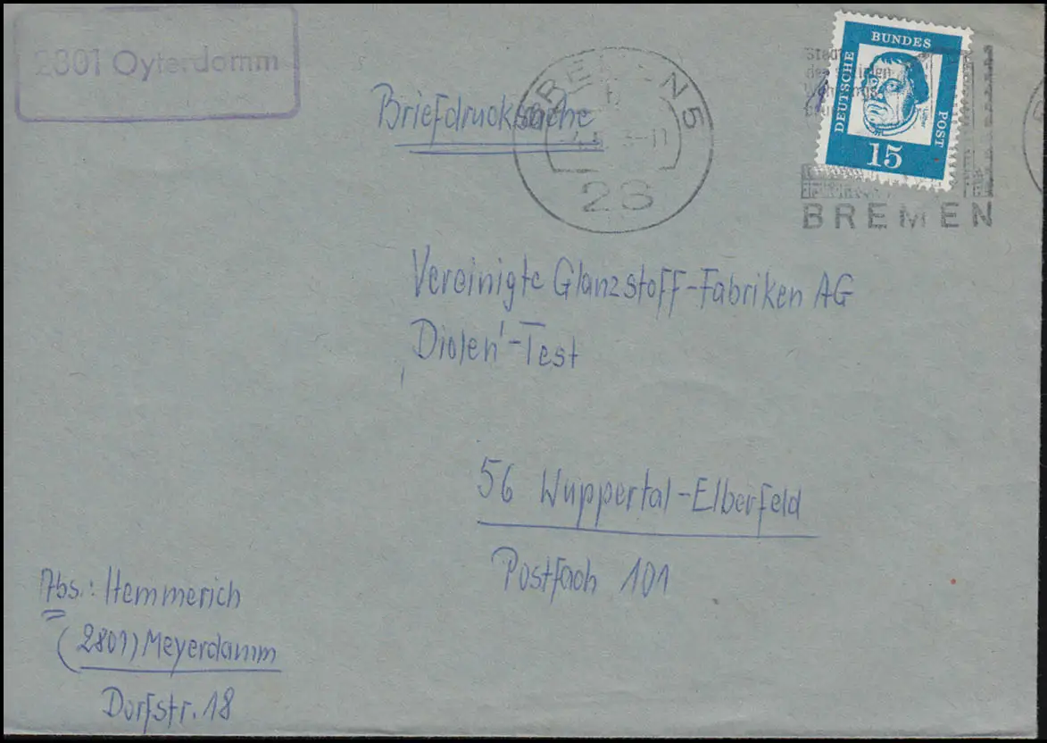 Temple de Landpost 2801 Oyterdamm sur l'impression de correspondance BREMEN 5 - 4.3.1963