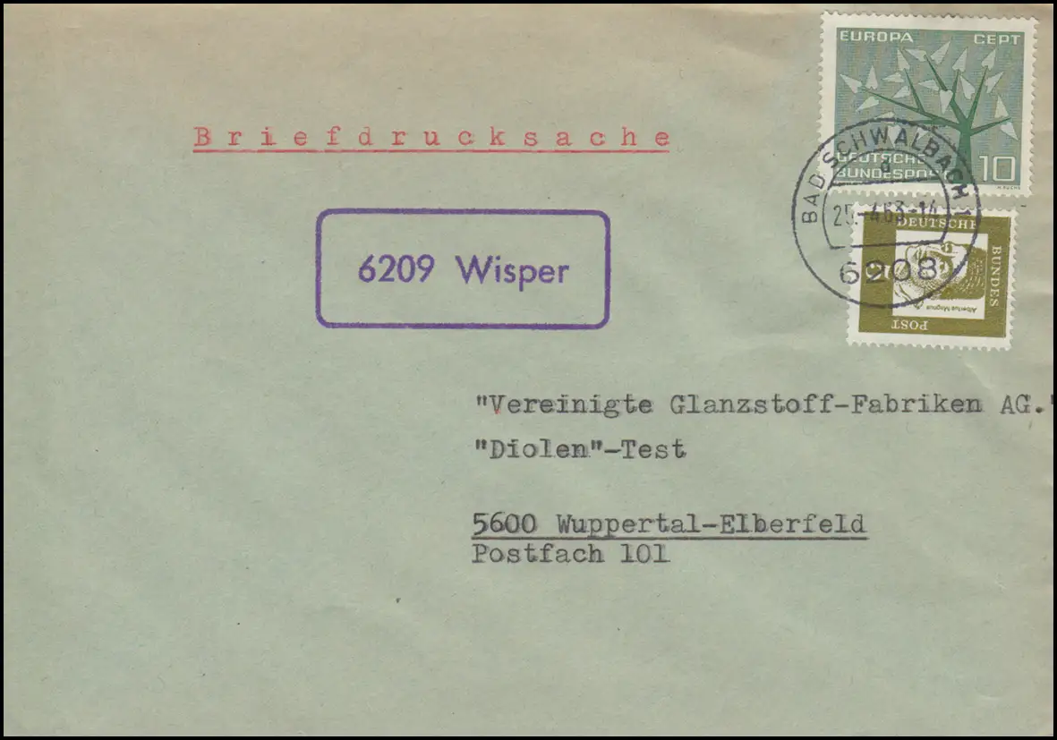 Temple de Landpost 6209 Wisper sur l'impression de correspondance BAD SCHWALBACH 25.4.1963