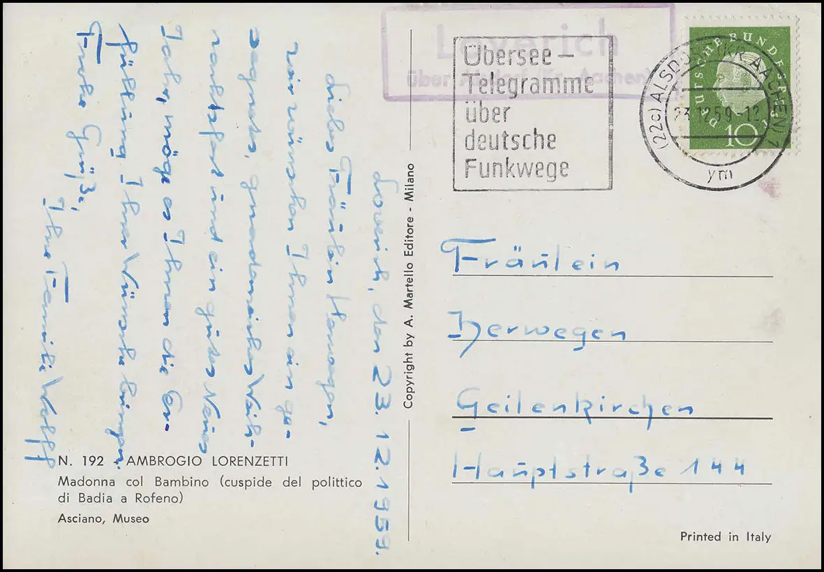 Temple de Loverich par l'intermédiaire d'ALSDORF (CR. ACHEN) 23.12.59 à AK Modonna
