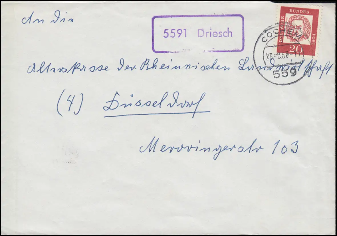 Temple de la poste agricole 5591 Driesch sur lettre COCHEM 23.8.1963