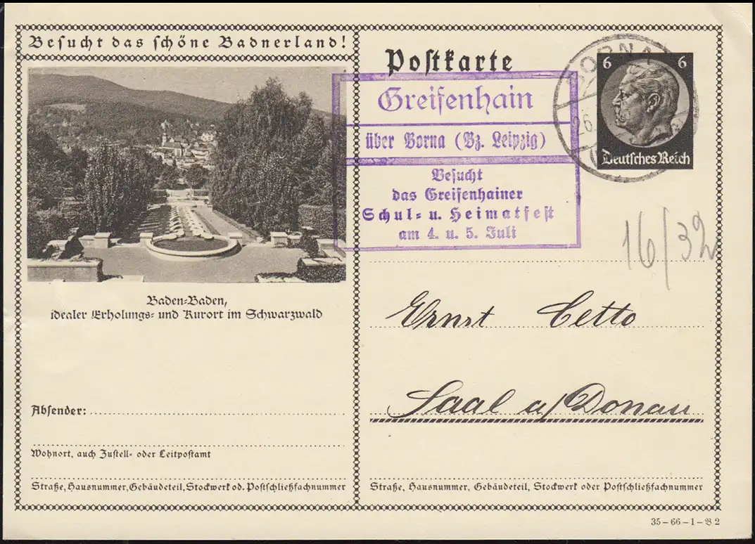 Le Temple de Landpsots est un 6-ème étoile: Griffenhain sur Borna (Br. Leipzig) Assiste à la fête de Greifsenhaine, les 4 et 5 juillet, sur la carte postale Baden-Baden, bord de carte légèrement à gauche Numéro de catalogue: P236 Examen: original Référence d'article: 00000000021831