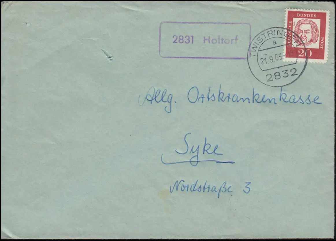 Temple de la poste de campagne 2831 Holtorf sur lettre TWISTRINGEN 21.9.1963