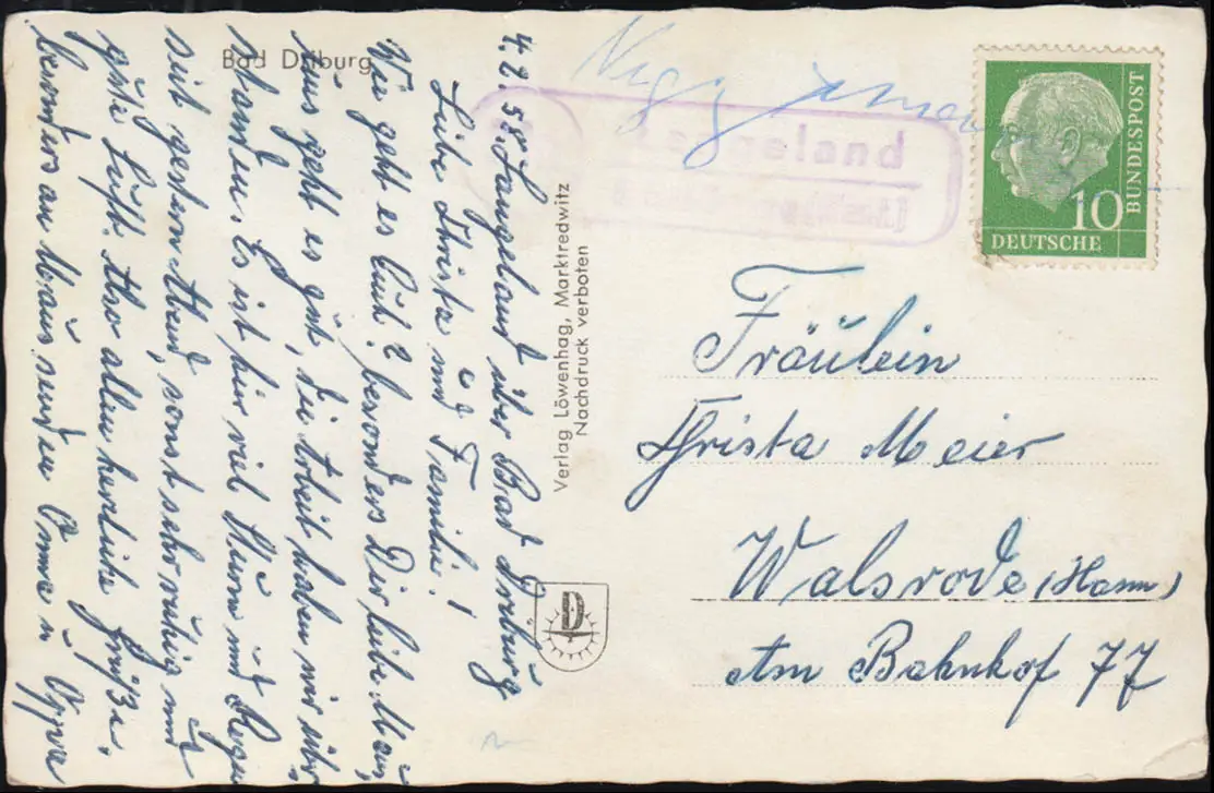 Temple de la poste de campagne Langeland par BAD DRIBURG 1958, correspondant AK Driburg Sentier de randonnée