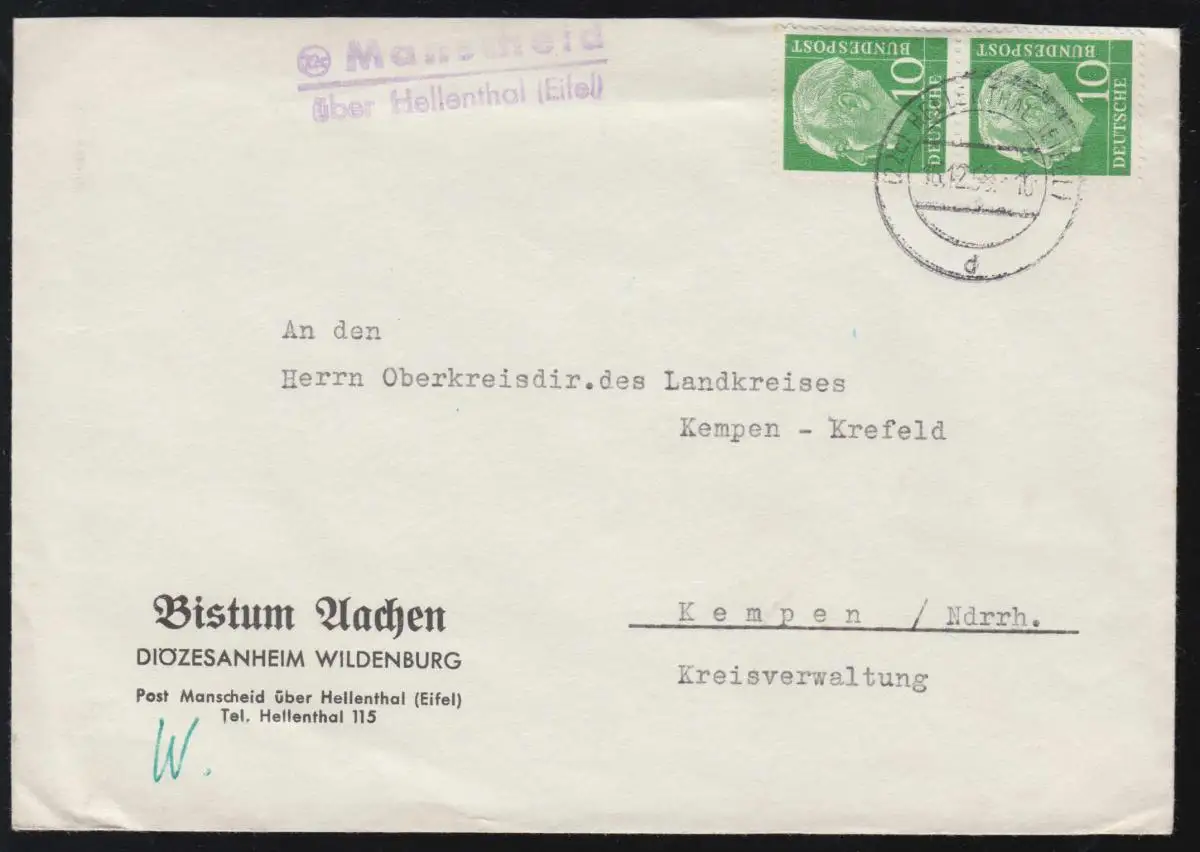 Temple de la poste de campagne Manscheid sur HELLETHAL (EIFEL) 16.12.1958 Lettre à Kempen