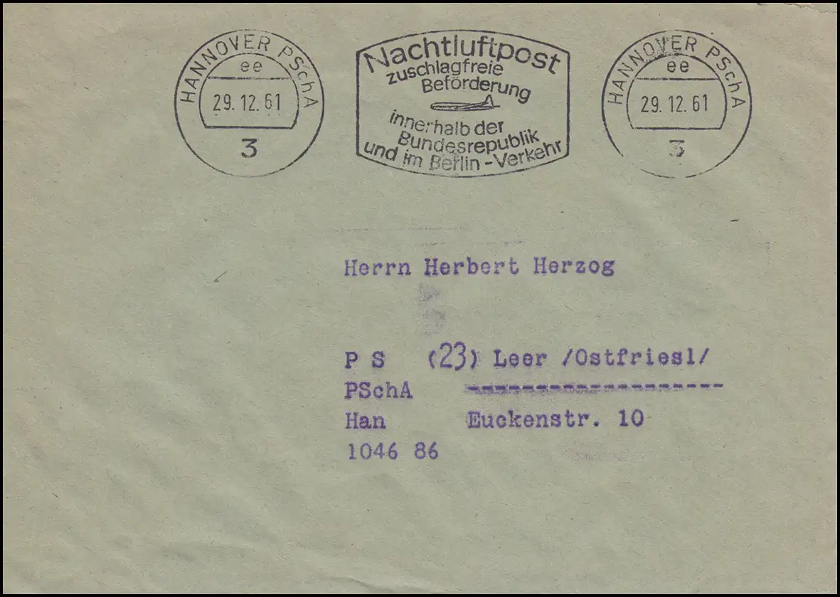 Temple du bureau de poste HANNOVER 29.12.61 poste de nuit gratuit ... sur lettre