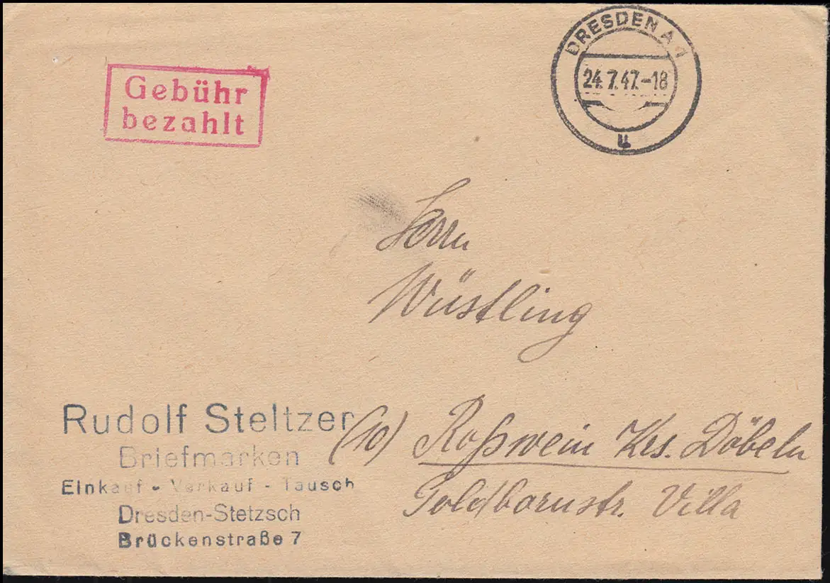 Temple payant DRESDEN 24.7.47 sur le timbre-poste-stelltzer n. Roßwein