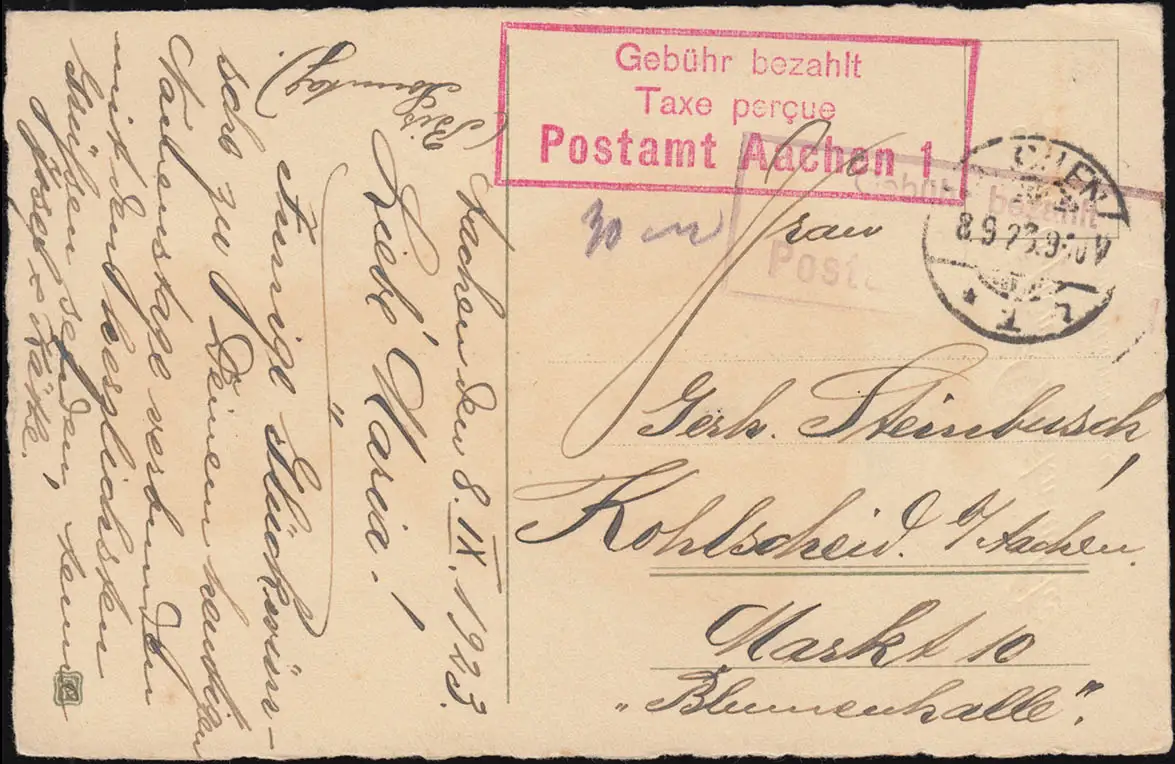 Temple payant de poste Aachen 1 / AACHEN 8.9.1923 sur carte de jour de nom