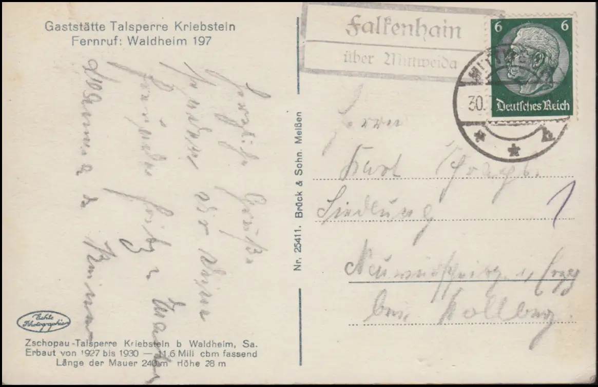 Templier de la poste de campagne Falkenhain sur MITWEIDA 30.7.1935 sur AK Talverke Kriebstein