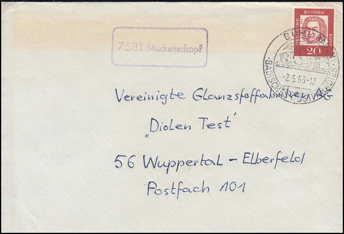 Templier de la poste de campagne Muckenshopf Lettre SSt BÜHL (BADE) Paradis des fruits 2.5.1963