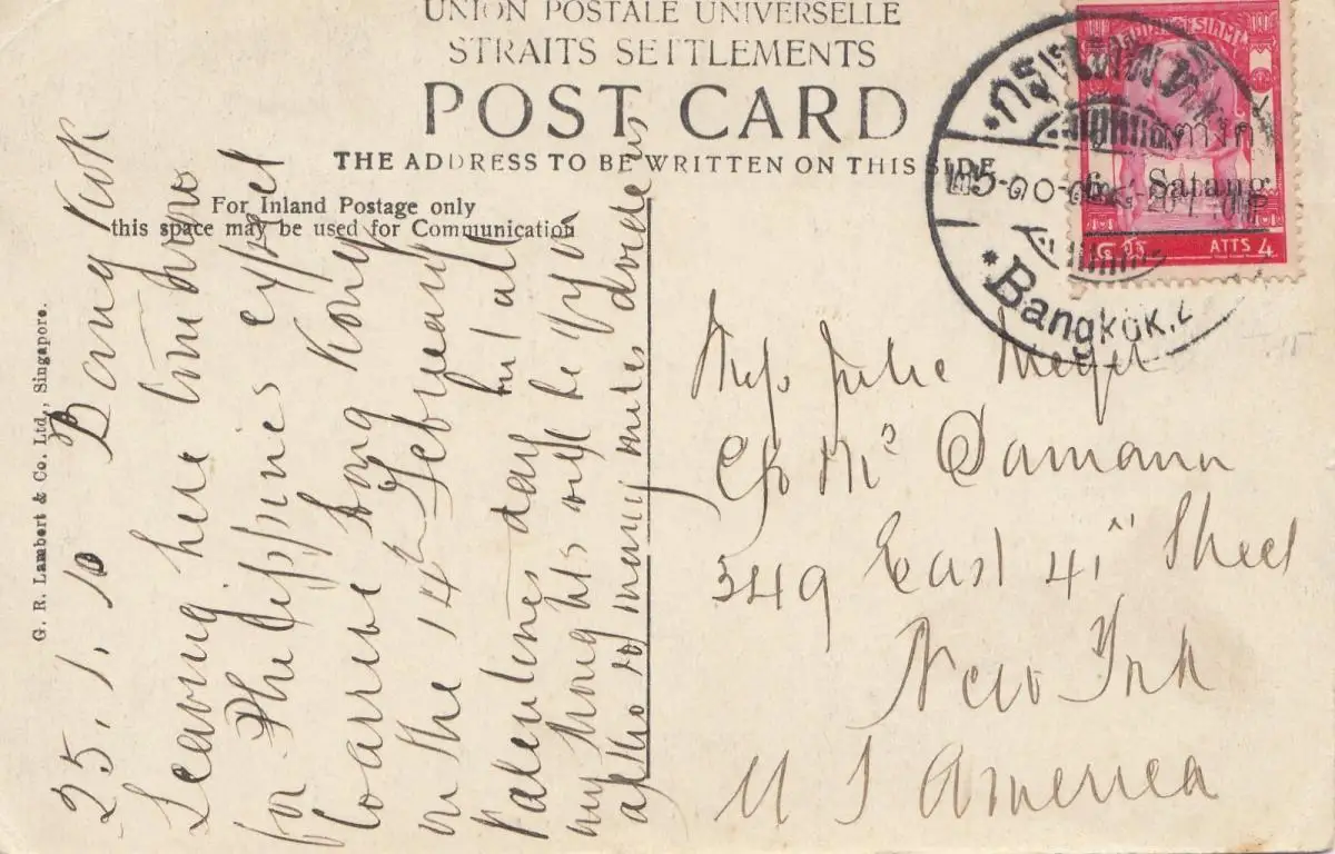 Thaïlande 1910: carte postale Istana of Johore/Bangkok to New York