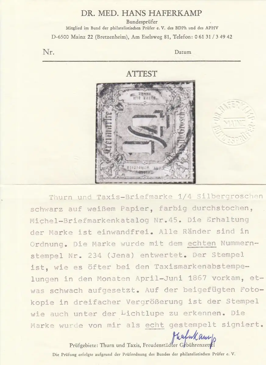 Thurn &Taxis, Mi Nr. 45, no 234 (Jena), BPP Attest