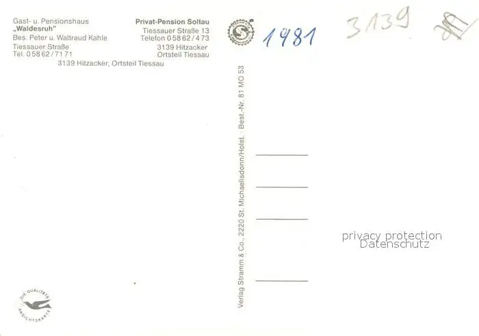 Tiessau Gasthaus Pension Waldesruh Pension Soltau Landschaftspanorama Partie an der Elbe Tiessau postalisch nicht gelaufen 1981 Erhaltung siehe scans [FriedD77] Frierer