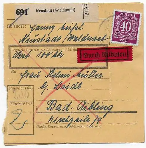 Carte de paquet 1948: Regensburg vers Bad Aibling, Urgent