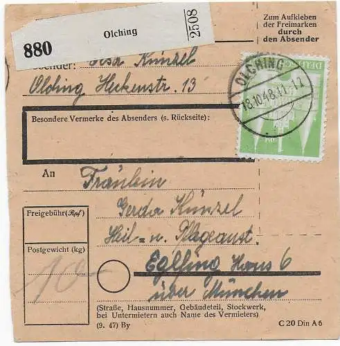 Carte de paquet 1948: Munich après Eglfing, Acceptation, Formulaire spécial