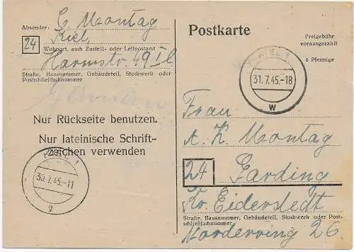Carte de paquet Itzehohe vers Ottendickel/Haar, 1948, MeF