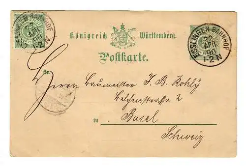 Wurtemberg Carte postale P 26, KIRCHHEIM sous TECK 3.4.1888 après METZINGEN 3.4.8