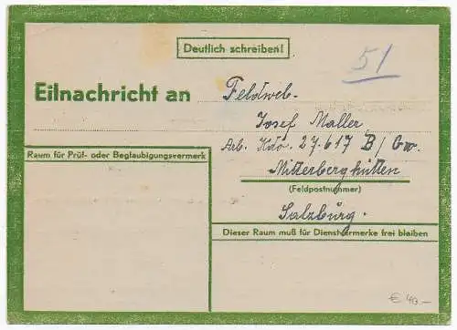 Envoi mensuel gratuit de colis 1940 Poste de campagne No 09577 vers Bernburg