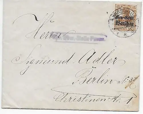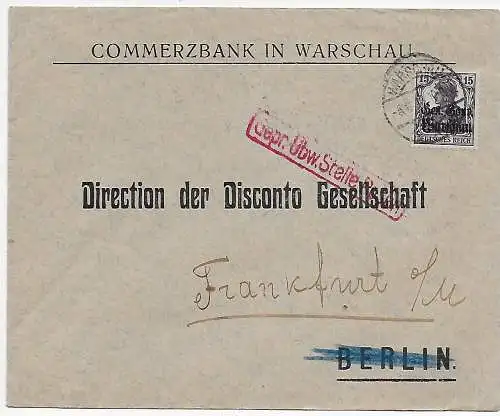 Inscription 1916 Varsovie - Bes. I. WK à Berlin, censure, multifrançature