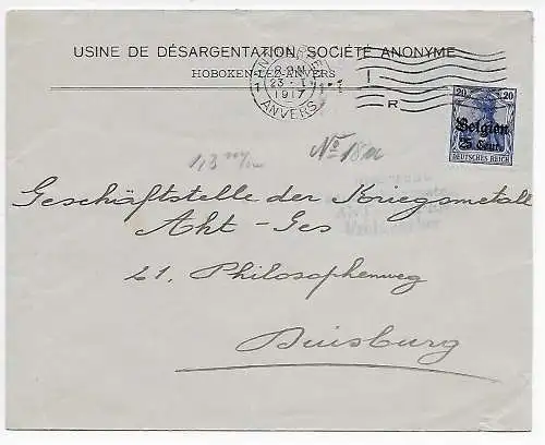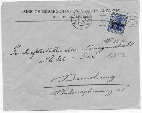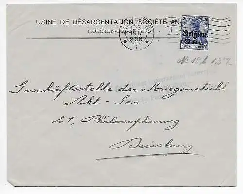 Instrument I. WK Belgique: Lettre recommandé Bruxelles à Hambourg, censure Cöln-Deutz