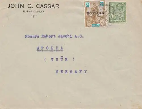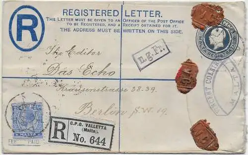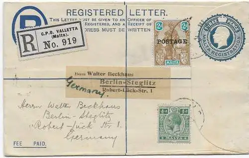 Malte: 1921: lettre recommandée Enveloppe complète de la Valette à Weimar