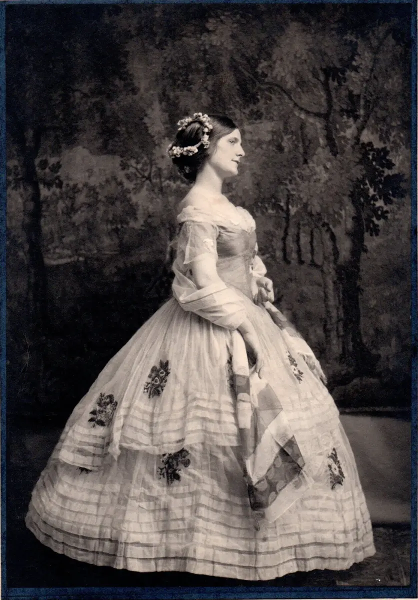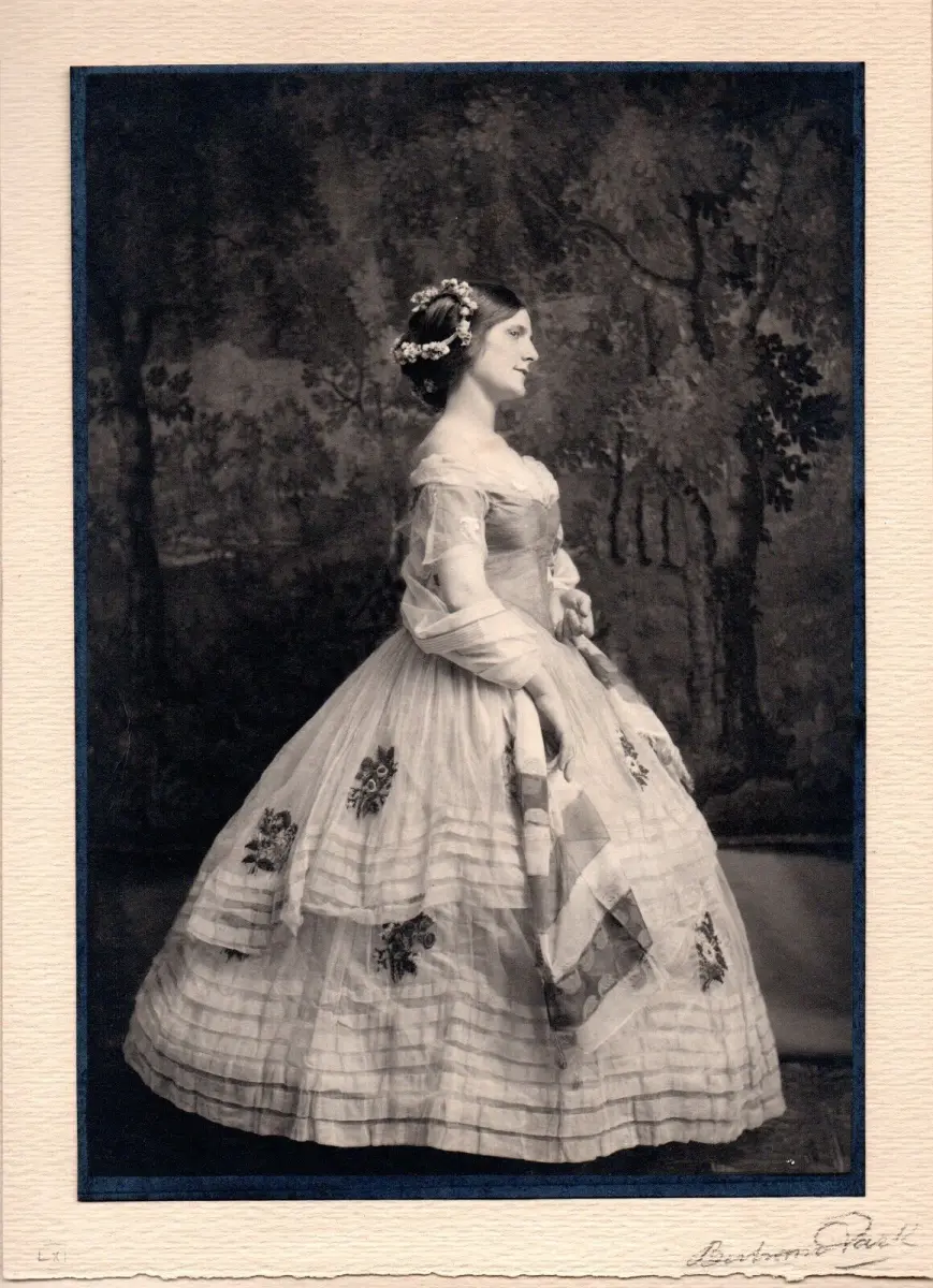 Modèle portant une robe d'époque 1850-1860, à crinoline, motif espagnol, brodée de roses devant décor tapissé d'atelier