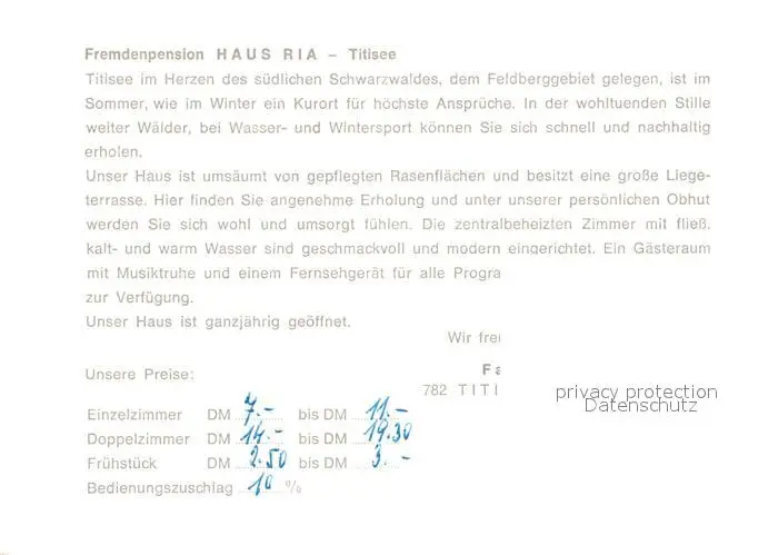 Titisee Pension Haus Ria Feldberggebiet Schwarzwald Fliegeraufnahme Titisee postalisch nicht gelaufen nach 1965 Werbekarte (keine Postkarte) Erhaltung siehe scans [FriedD77] Werbekarte (keine Postkarte) Frierer