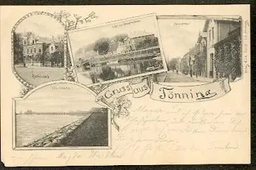 Tönning. Gruss aus... Rathaus, Hafen mit Hauptzollamt, Deichstrasse, Fährbrücke. - Gelaufen 1899. Kl. Verlust unten links. (NPLZ 25832).