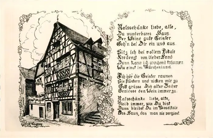 Traben Trarbach Historische Ratsschaenke Weinhaus Fachwerkhaus Zeichnung Kuenstlerkarte Gedicht Traben Trarbach