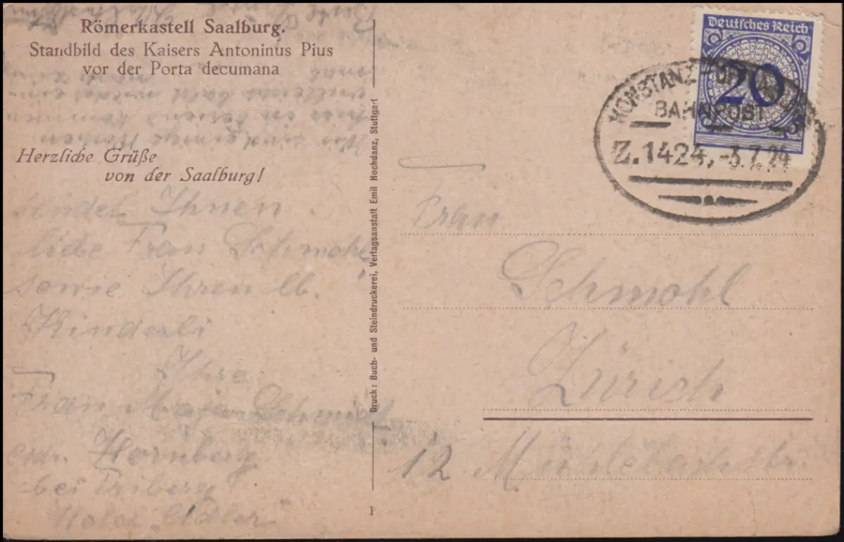 Trains de train KONSTANZ - OFFENBURG Train 1424 - 3.7.1924 sur AK Römerkastella Saalburg