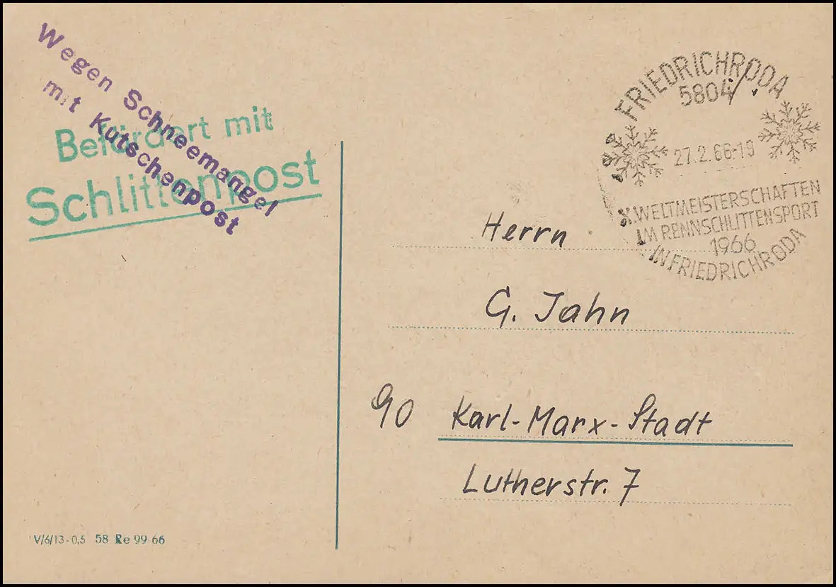 Transporté avec du courrier de traîneau / En raison de la pénurie de neige avec le courrier par calèche SSt 27.2.1966