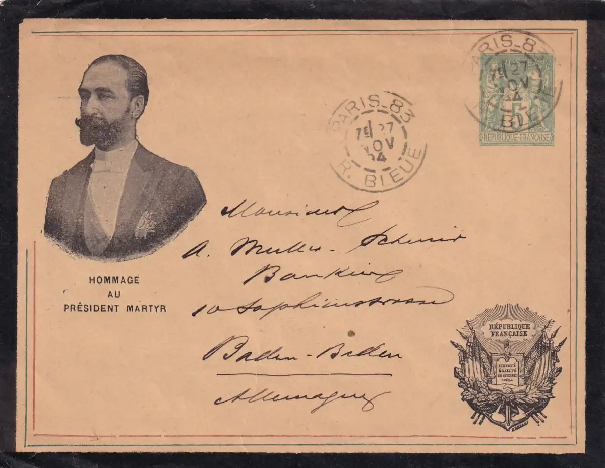 Lettre de deuil Paris 1894 to Baden Badden, Hommage au President Martyr