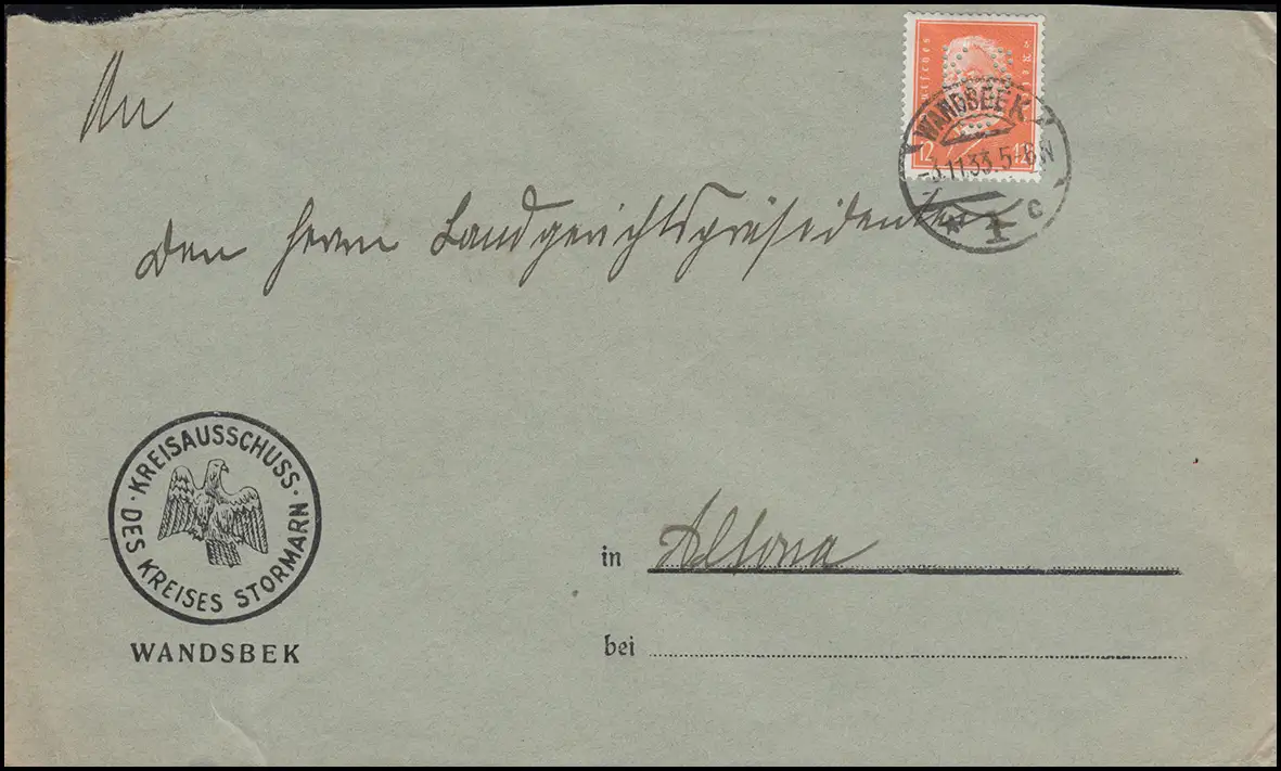 Trou de l'entreprise KSW sur 466 Hindenburg 12 Pf. comme EF sur lettre WANDSBEK 3.11.33